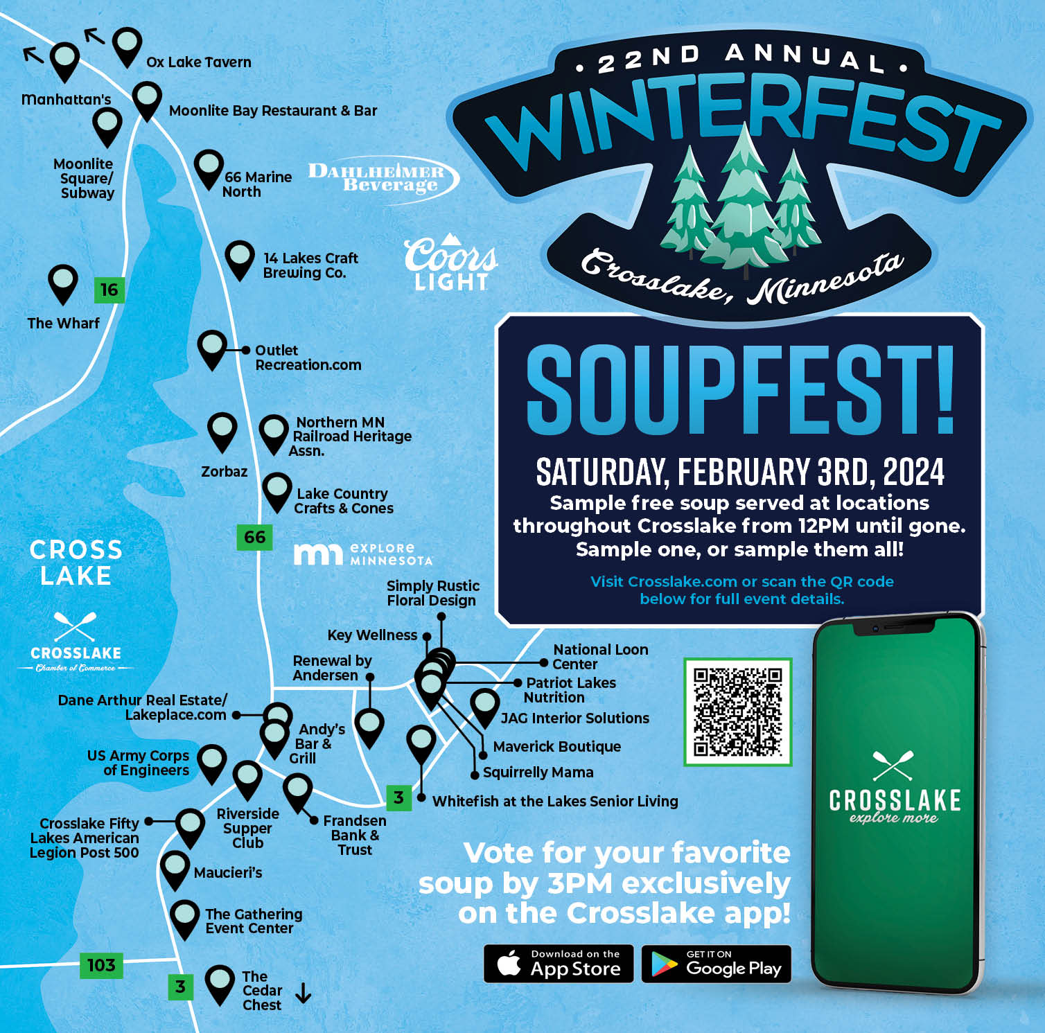 Tasting begins at noon and ballots are tallied at 3PM. Vote for your favorites on your mobile phone using the free Crosslake App. SoupFest winners will be announced at 5PM.