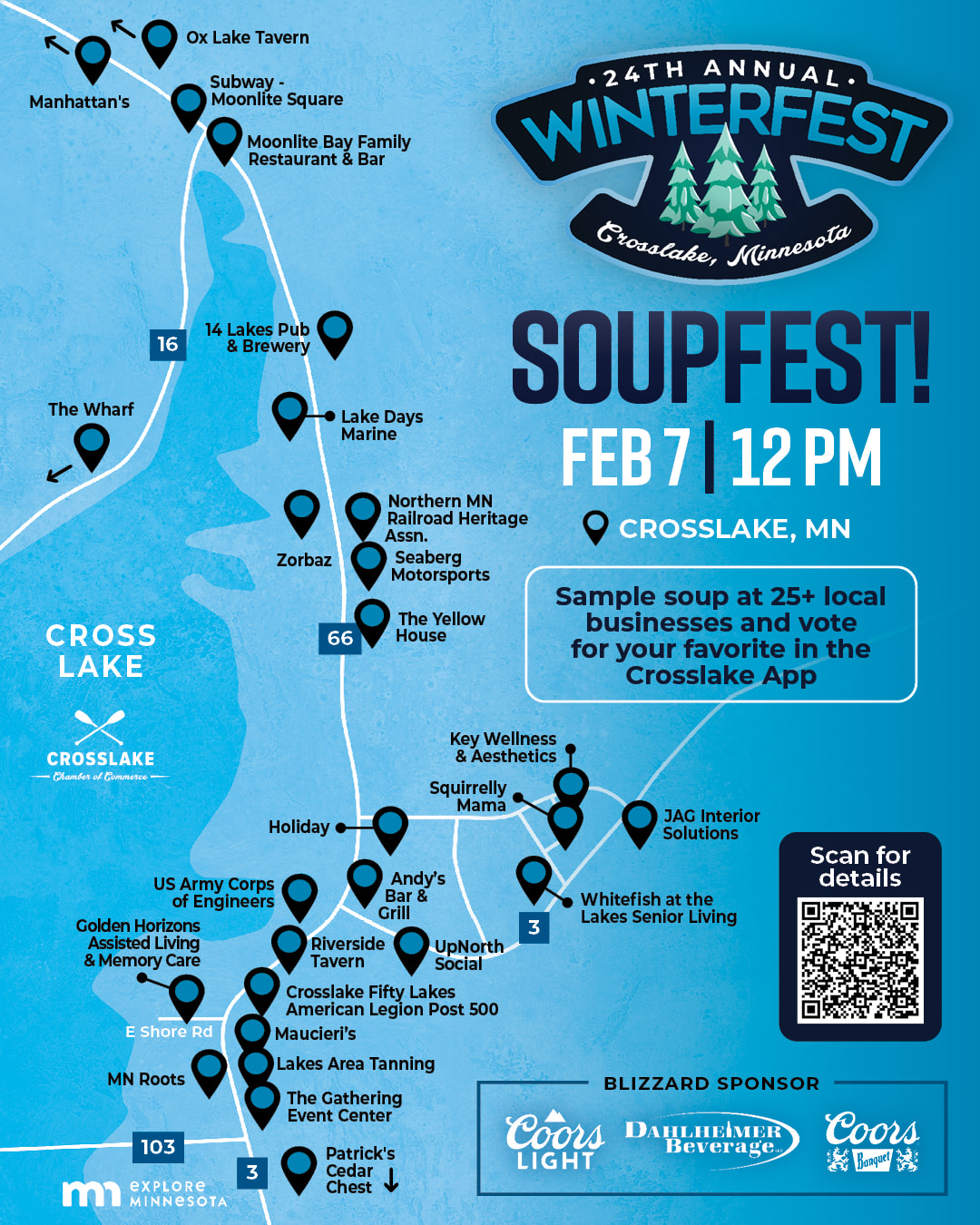 Tasting begins at noon and ballots are tallied at 3PM. Vote for your favorites on your mobile phone using the free Crosslake App. SoupFest winners will be announced at 5PM.