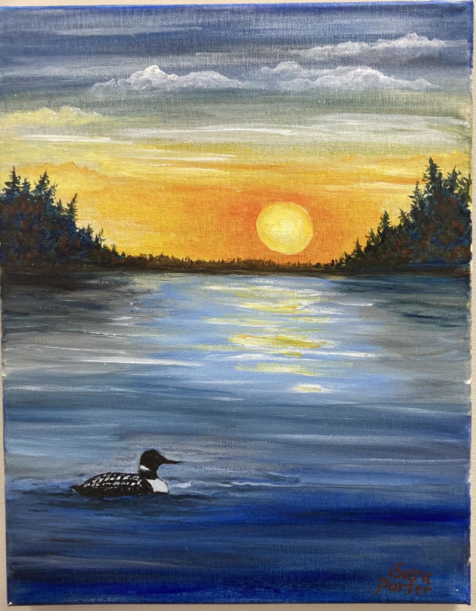 In honor of the annual Loon Festival in Crosslake, we have chosen “Loon Call” to paint on Saturday the 21st of June. After enjoying many of the events in town, make your day complete with a loon painting all your own! Finish in time to hit the food trucks before they close and enjoy the live music in Town Square. (Visit the Crosslake Chamber website for a full Loon Festival schedule) Feel free to bring your own food and snacks to munch on as you paint. Coffee and tea are available. This painting is done with acrylic paint, on an 11×14 canvas. Follow along, step by step with your friends or family (16+ please) and make it a memorable weekend sure to become a tradition.