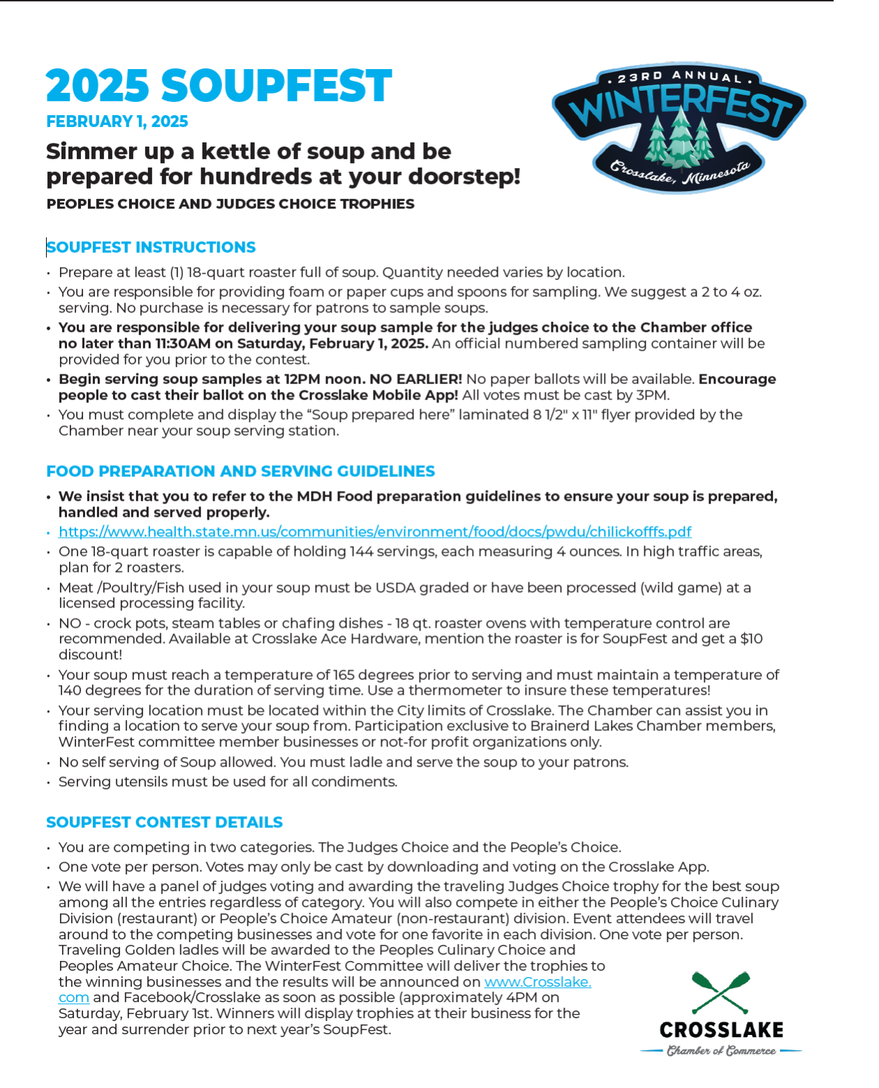 Tasting begins at noon and ballots are tallied at 3PM. Vote for your favorites on your mobile phone using the free Crosslake App. SoupFest winners will be announced at 5PM.
