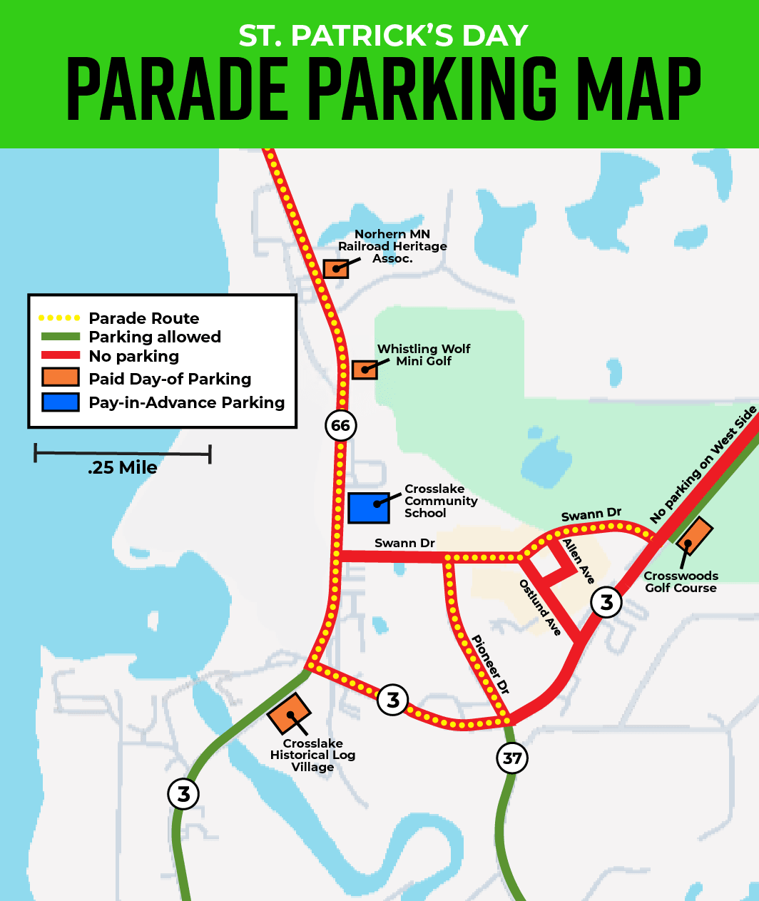 - 10:30 AM - 1 PM // Parade Participant Shuttle Service - Complimentary for parade participants only. Park & ride the free shuttle from The Log Church (37218 CR 66) to Crosslake Community School. (One way only before the parade - no shuttle after the parade)