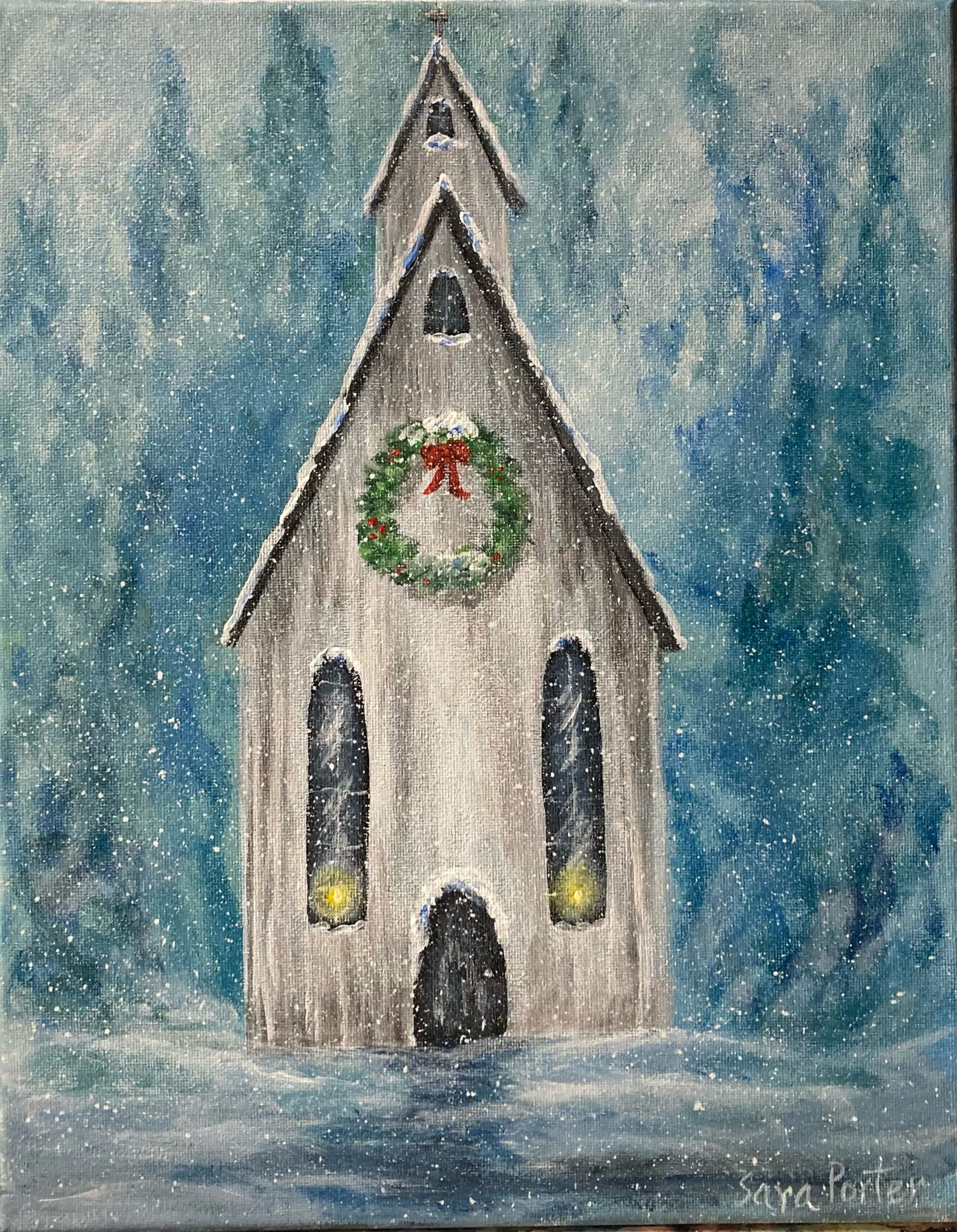 The classic, nostalgic scene of a chapel nestled in the woods on a snowy evening. Paint along, step by step, on a 12×16 canvas, acrylic paint. Ages 16+ encouraged
