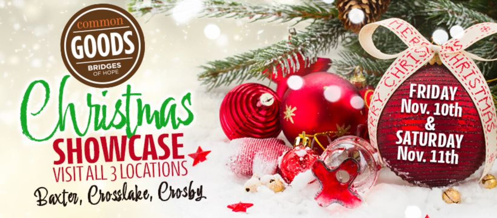 Common Goods invites the community to join in its 2nd annual Christmas Showcase, set for 9 a.m. to 6 p.m. Nov. 10-11. During the event, customers can enjoy refreshments, Christmas music, and new holiday displays at all three Common Goods locations in Baxter, Crosslake and Crosby. Participants can pick up a Christmas passport at any of the three locations and get it validated during the two-day event by visiting all three stores to be entered into a drawing to win a $100 Common Goods gift certificate. Please Note: Our stores will be closing at 2 pm on Thursday, Nov 9th in order to prep for this eventImages