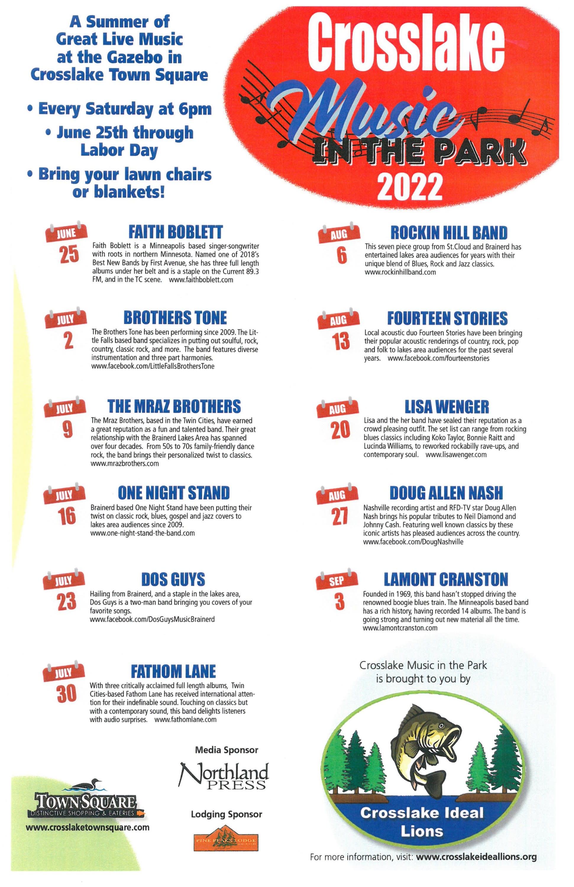 The Crosslake Ideal Lions has arranged a fabulous slate of live music coming to Crosslake's Town Square every Saturday night beginning at 6 p.m.