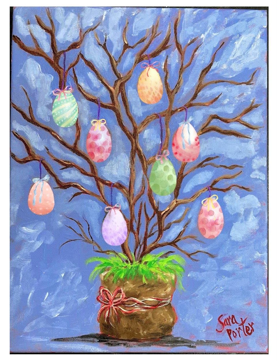Project Description: This 12×16 project is made with acrylic paint and paper “eggs” cut with templates. Choose paper from our selection to customize your Easter Tree. Make it your own! A basic outline is prepared in advance. No experience necessary. Ages 16+ recommended