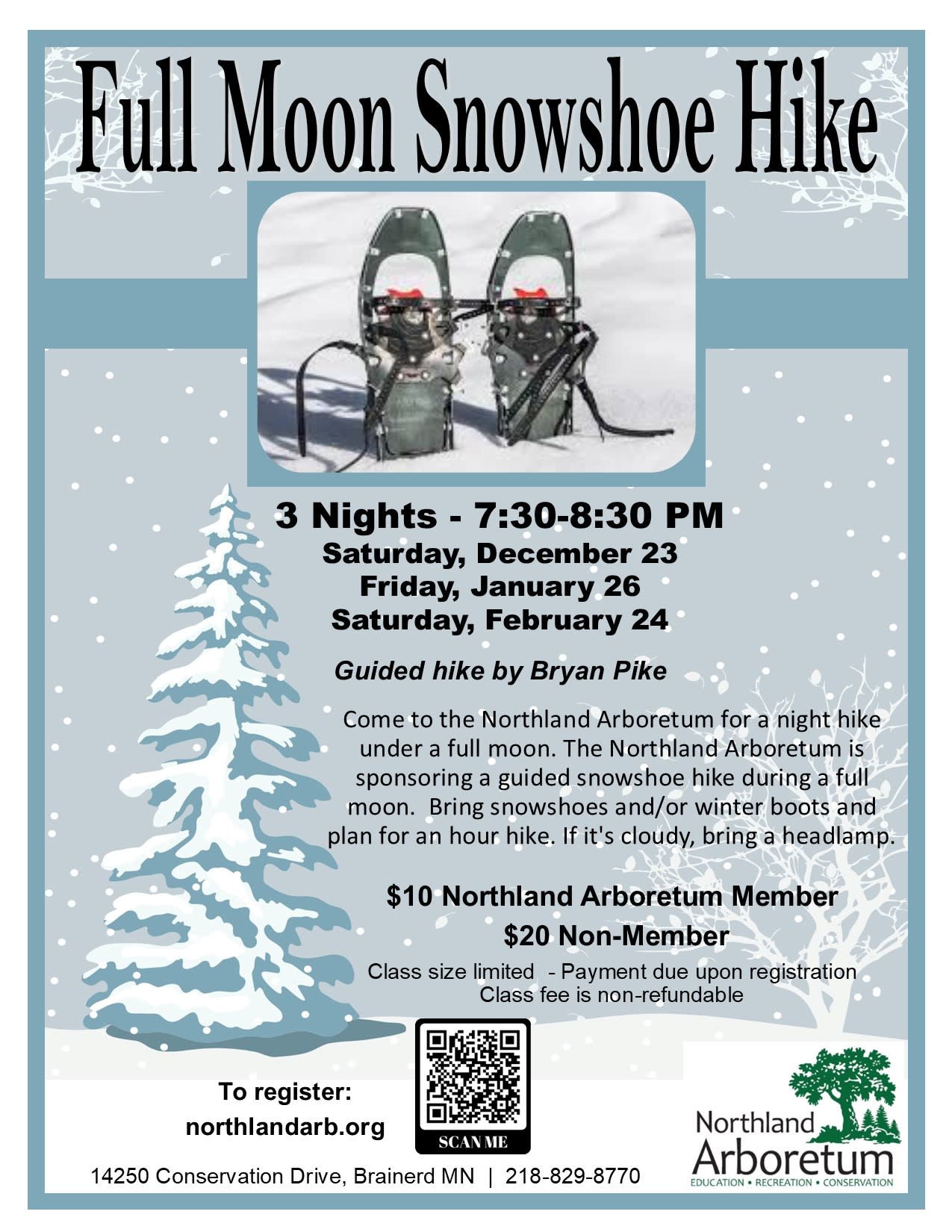 Come to the Northland Arboretum for a night hike under a full moon. This is a guided hike led by board member, Bryan Pike. Bring snowshoes and/or winter boots and plan for an hour-long hike. If it's cloudy consider bringing a headlamp.