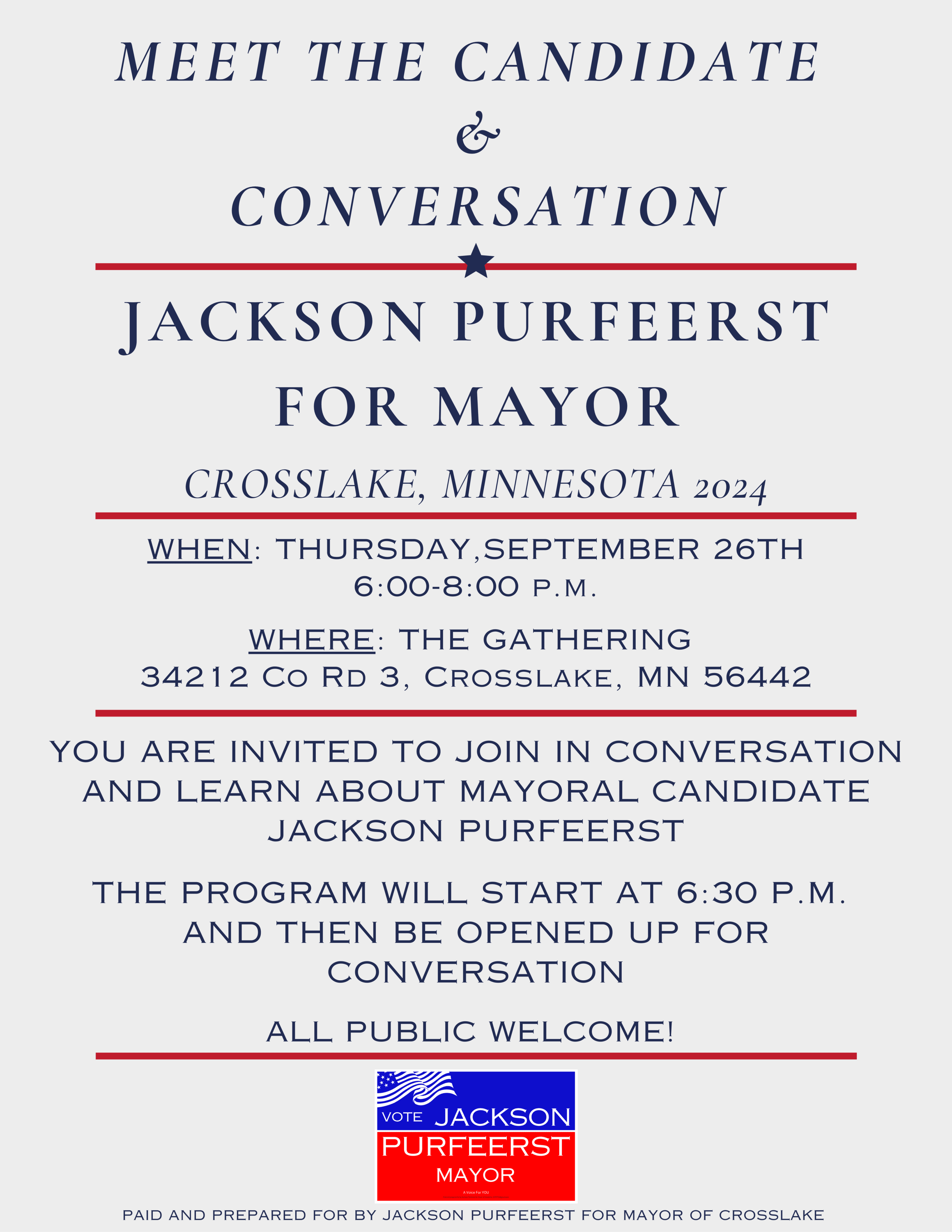 You are invited to join in conversation and learn about Mayoral Candidate Jackson Purfeerst. THe program will start at 6:30 p.m. and then be opened up for conversation. All public welcome!