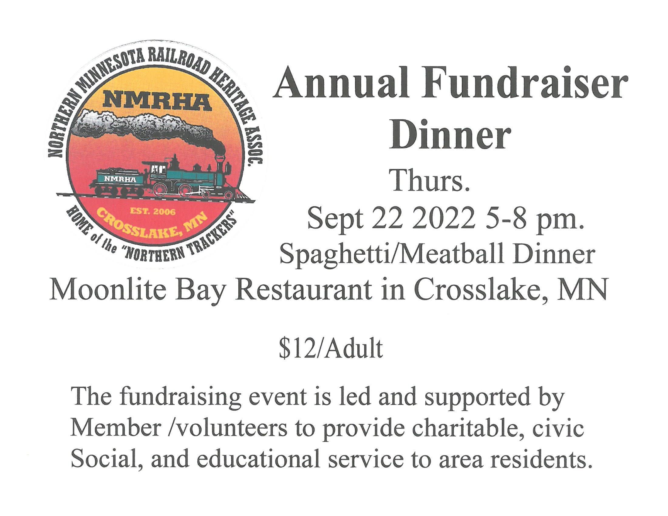 Northern Minnesota Railroad Heritage Assn. is hosting their annual Spaghetti Dinner Fundraiser at Moonlite Bay on Thurs. Sept. 22, 2022 from 5 - 8 p.m. Enjoy a great meal and learn more about the club. Get your raffle tickets to win a Blackstone Grill!