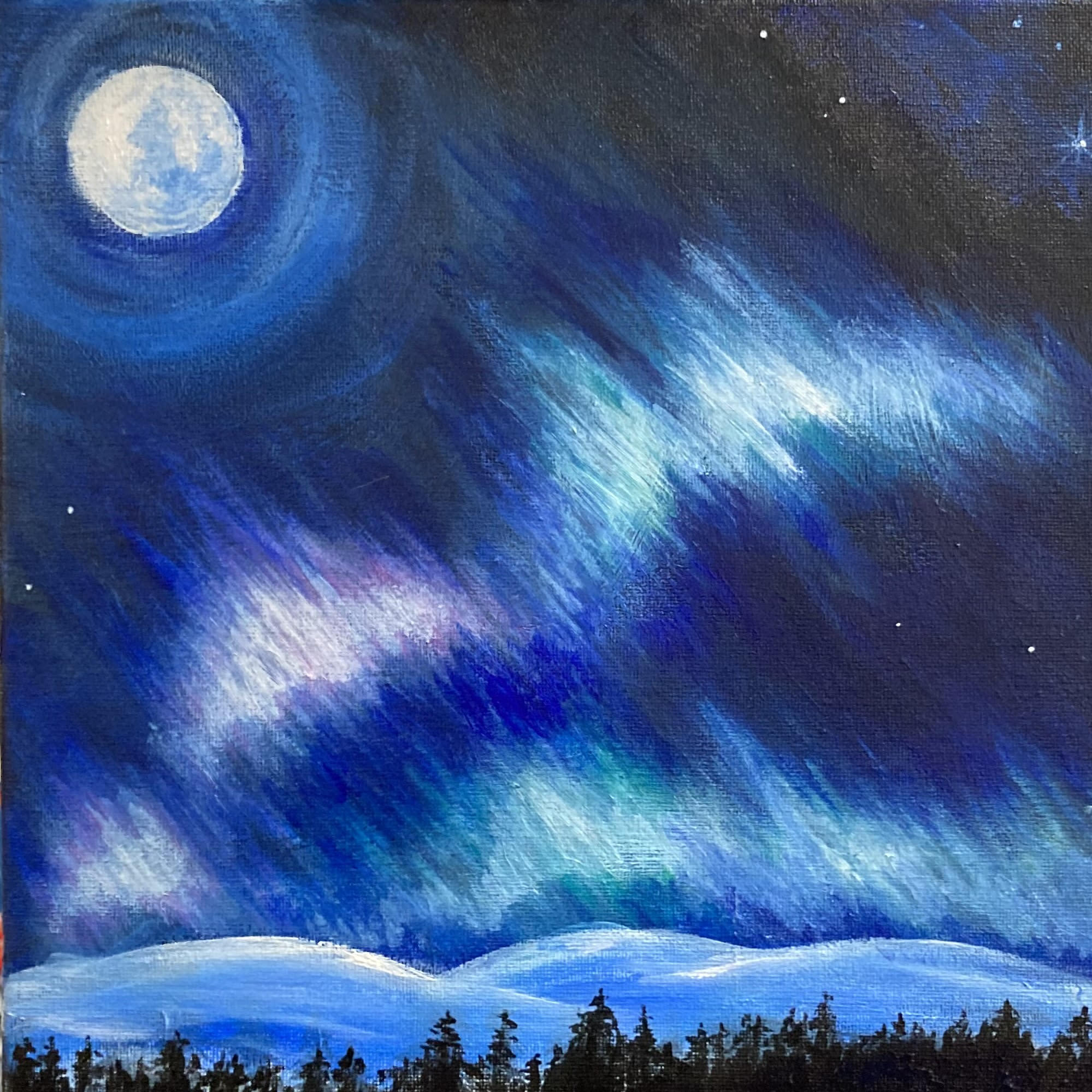Paint a winter silhouette against the beautiful Northern Lights. Step by step, acrylic 11x14 canvas.