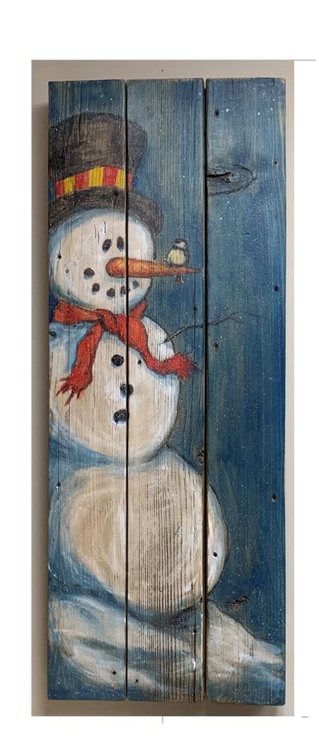 Painting of "Snowman on Wood" will be done on a slat plank of wood (not the 3 pieces as shown)....thus the Snowman can be painted on one side, with the back side used for another season scene (class sold separately). Class will run approximately 4 hours Size of wood plank is 16" x 48" Price of $89 includes all supplies and expert step by step instruction by Sara.