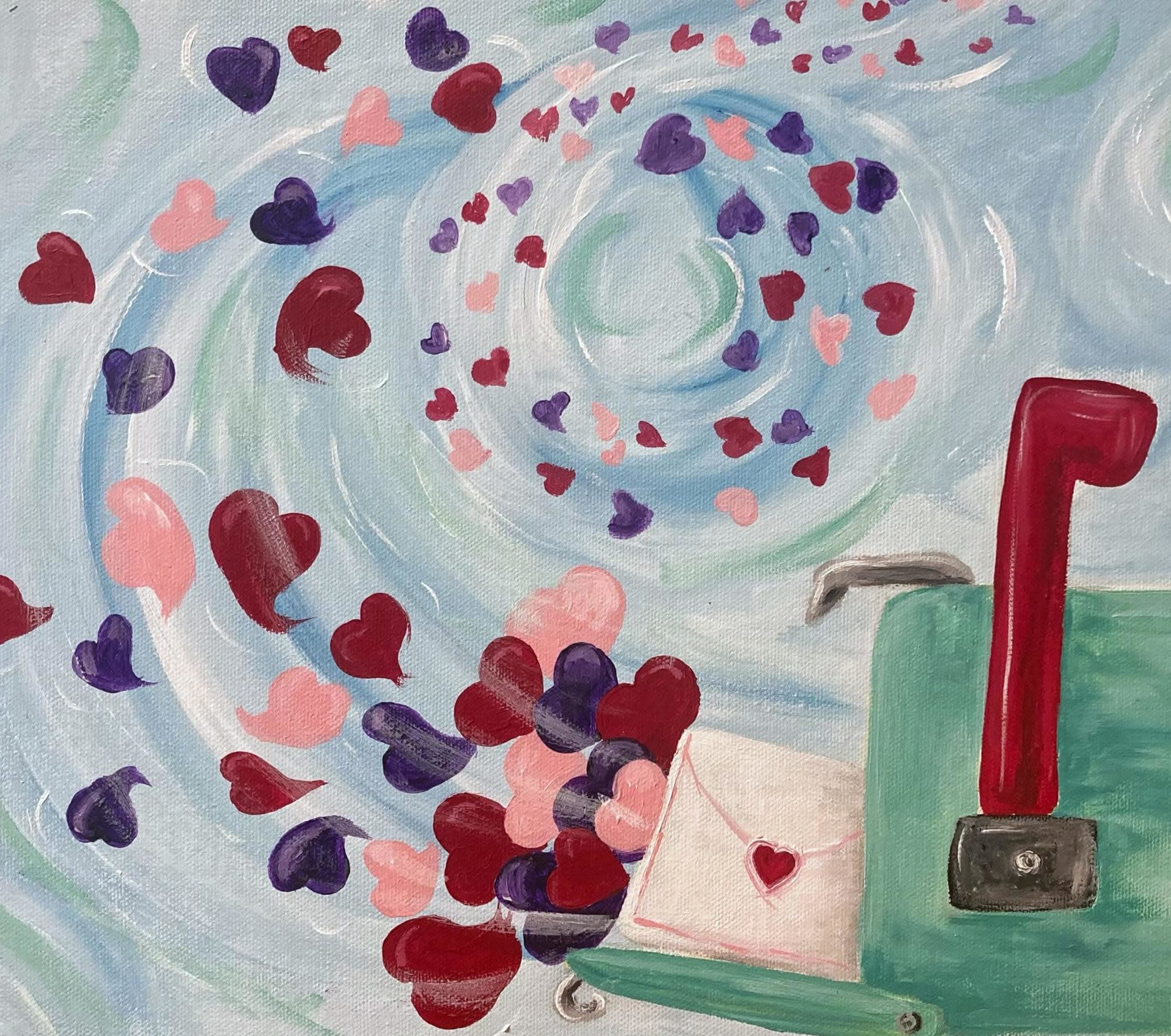Here’s a new take on a Valentine Card for that special loved one! Make it a date night for Valentine’s Day, (see our Friday night, February 14 offer) or add some love to your walls at home with this acrylic 12×16 painting. We take you step by step through the process, starting with a basic outline of the mailbox and card. While these are painted in various shapes as they fly through the wind, we’ve decided to make this a mixed media project, using heart-shaped hole punchers to modge podge a variety of paper hearts onto your painted canvas. Choose your own colors/designs/sizes to send your hearts flying through the wind! You have the freedom to be creative and add your own touch. Coffee, hot chocolate, and a variety of hot tea available on us, and in honor of this super sweet holiday, we gotta have the chocolates! $45 Ages 16+ please
